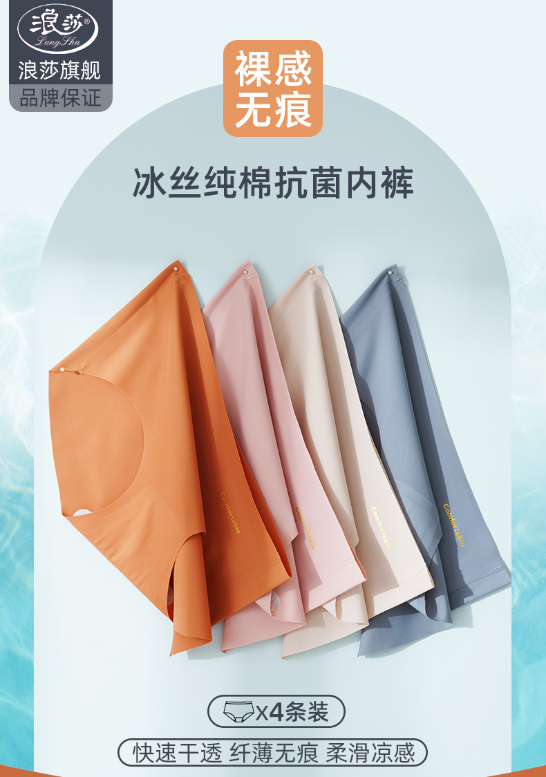 浪莎無痕內(nèi)褲女士冰絲純棉襠抗菌春夏薄透氣一片式中腰三角短褲ZW